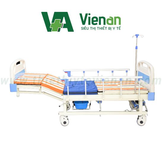 | Chức năng | Chức năng 1. Nâng đầu 0-85° - Cạnh giường 2 bên gấp vào chống ngã Chức năng 2. Nâng Chân Chức năng 3. Hạ Chân - Phần đùi được nâng cao, giúp người bệnh không trượt về phía trước khi ngồi Chức năng 4: Bô đi vệ sinh tại chỗ với cần gạt thông minh Chức năng 5: Chậu gội đầu ngay tại giường Chức năng 6: Nghiêng người trái 0-85 độ Chức năng 7: Nghiêng người phải 0-85 độ Chức năng 8: Bàn ăn Chức năng 9: Cây Truyền dịch Chức năng 10: Hạ đầu, đưa người bệnh về trạng thái cân bằng